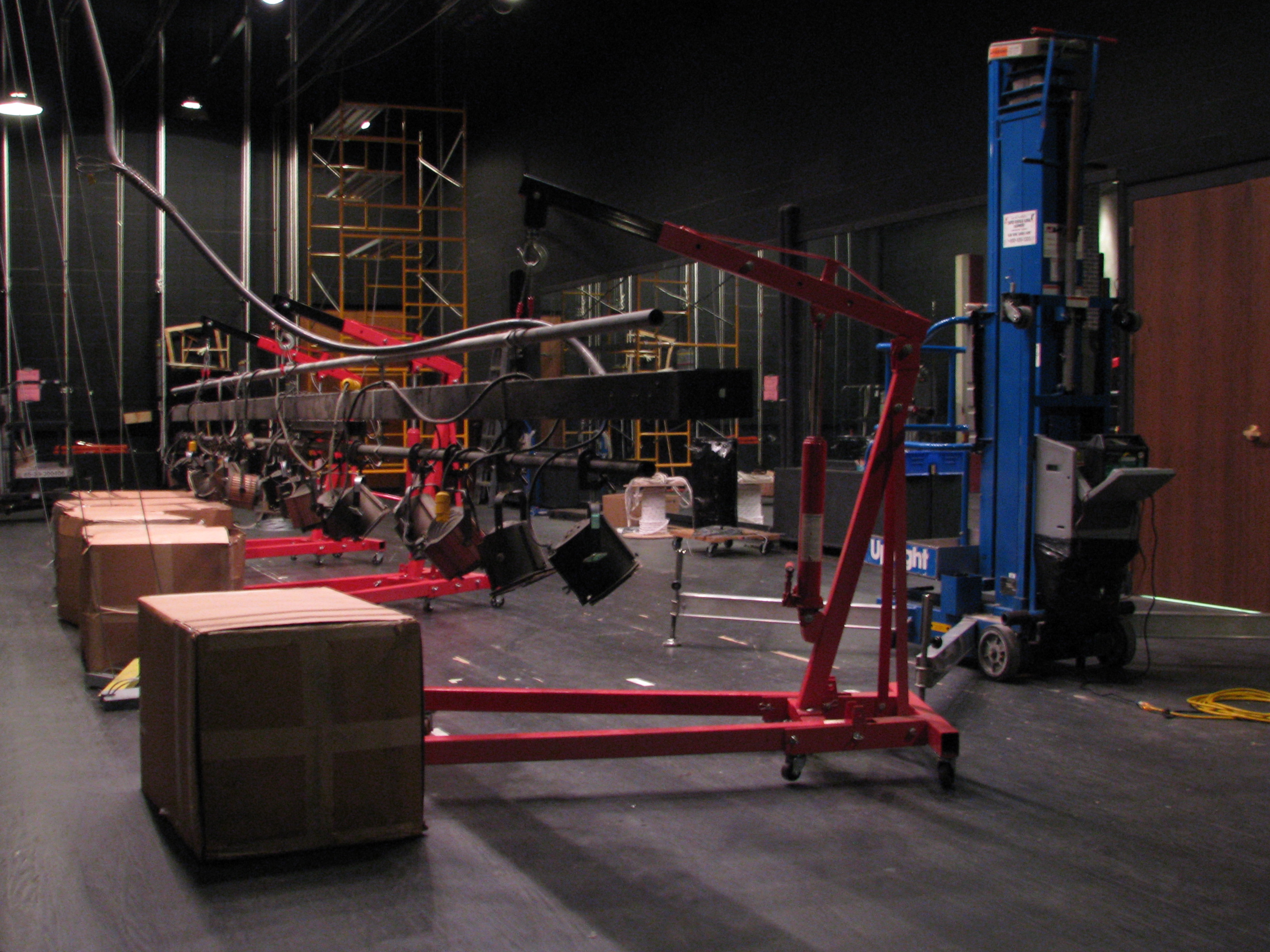The first day was spent on top of the scaffold taking down all of their soft goods:  main curtain, several pairs of legs, a few borders and couple of travellers.