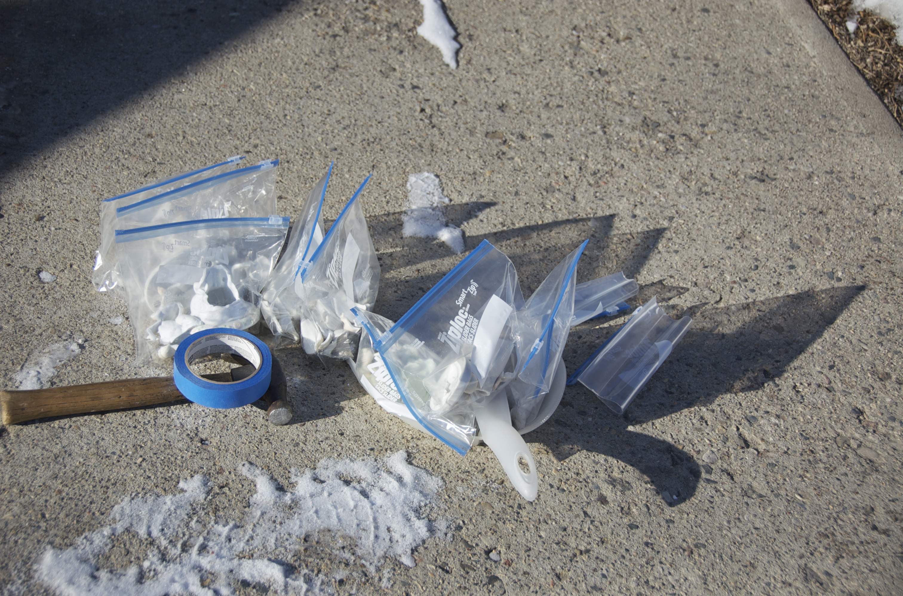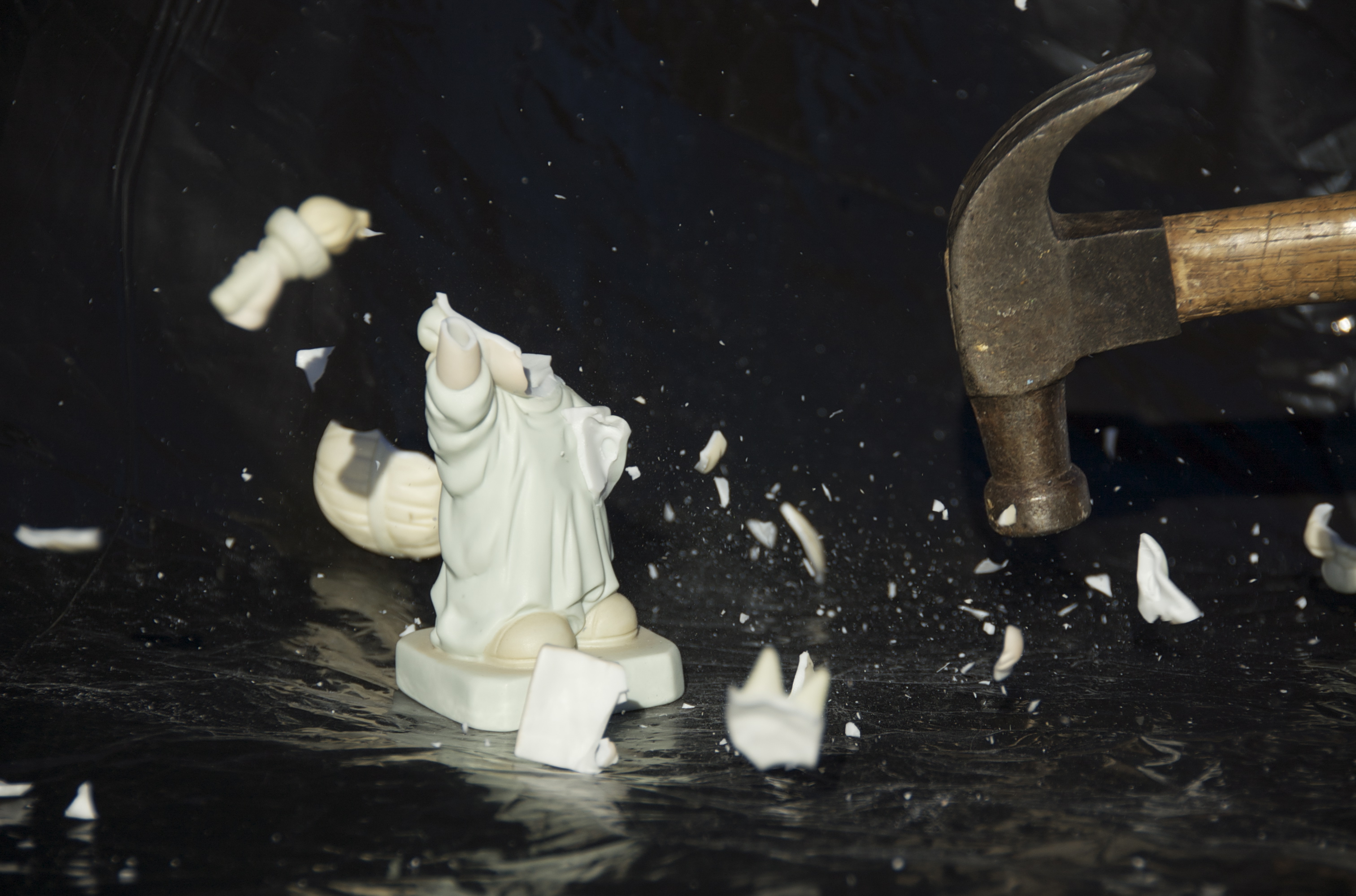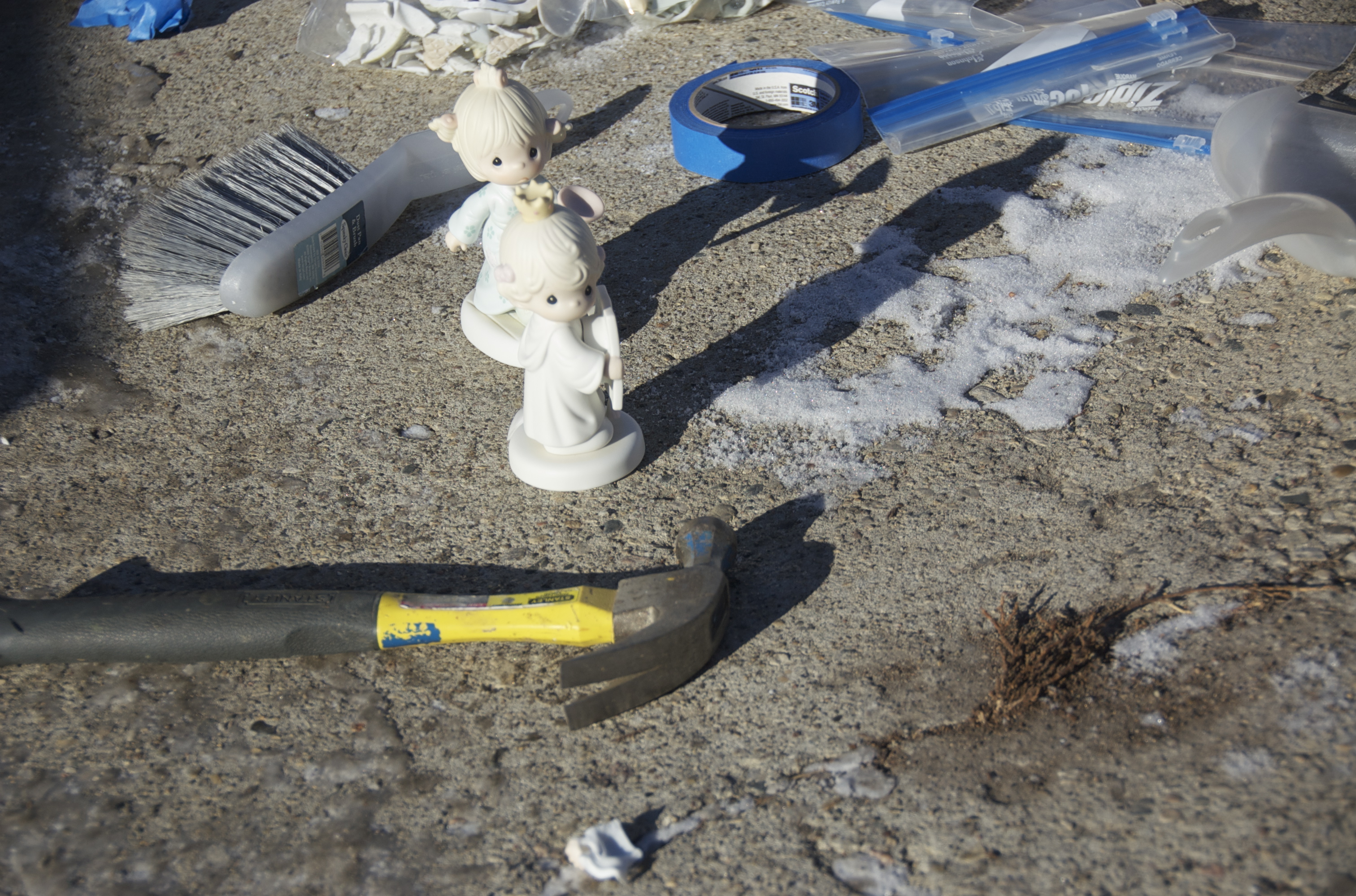 The other day I spent the morning helping a friend with an art project. She needed to smash several Precious Moments figurines and I helped her capture the excitement. Here’s some of the set-up: