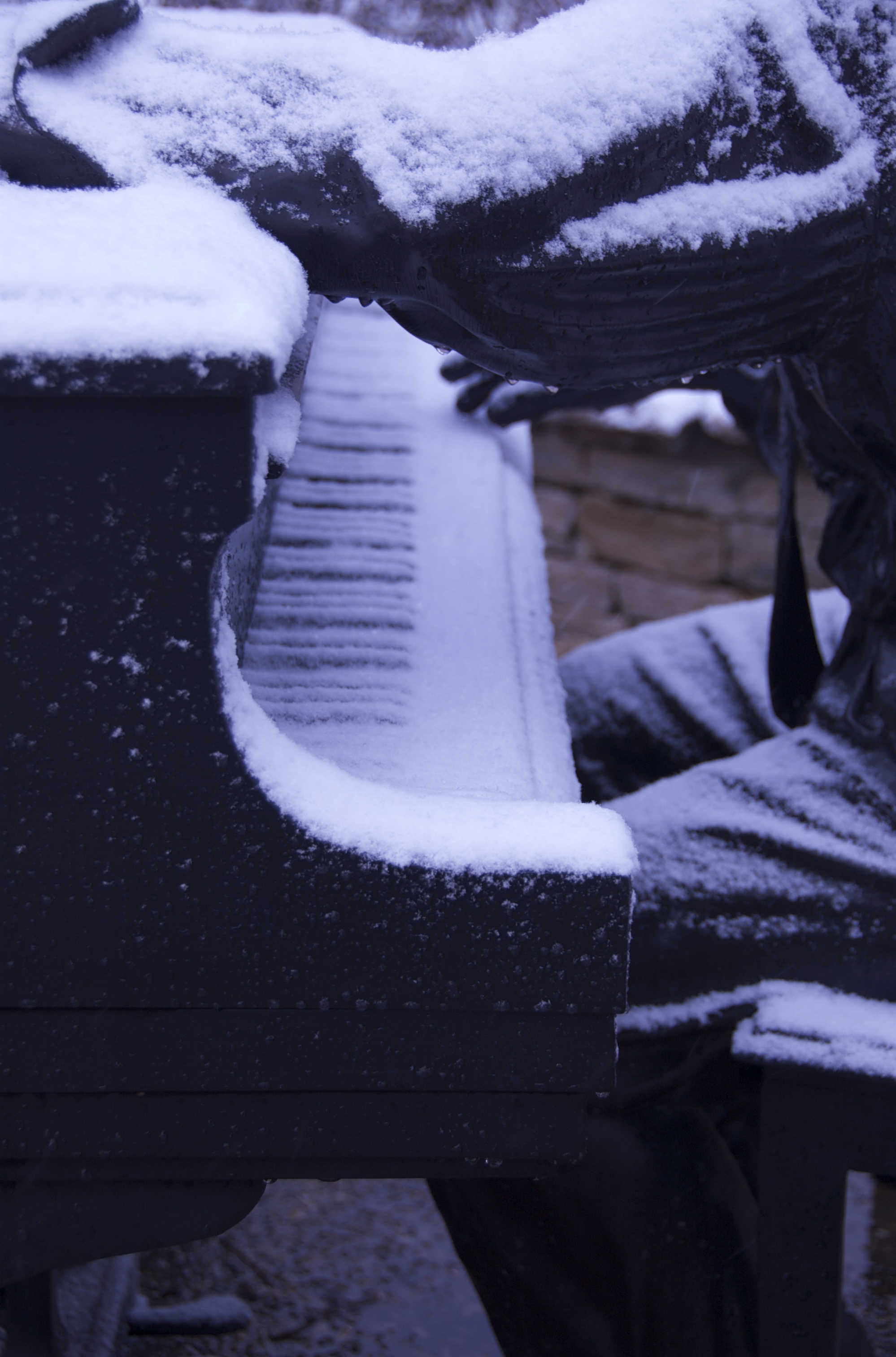 Tags: Bloomington, bronze, carmichael, Hoagie, hoagieland, hoagland, hoagy, Hoagy Carmichael, hoagyland, IU, keys, music, notes, snow, statue