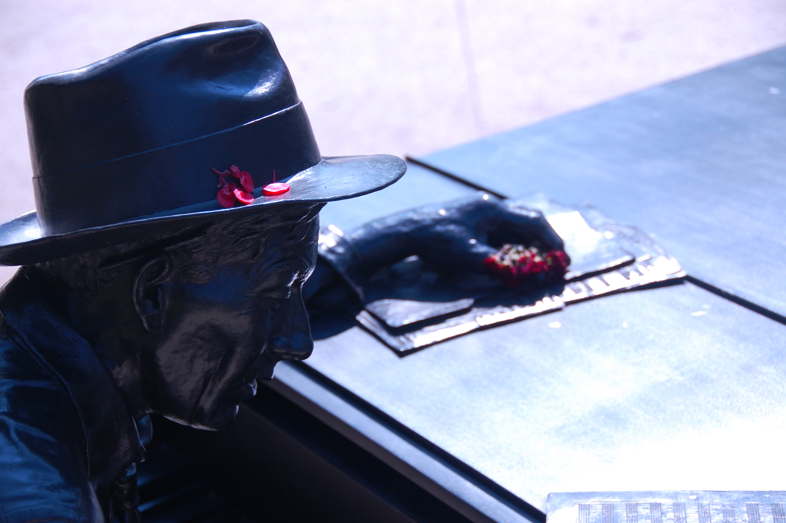 Tags: auditorium, Bloomington, bronze, hand, Hoagy Carmichael, Indiana, Indiana University, IU, petals, petunia, rain, statue